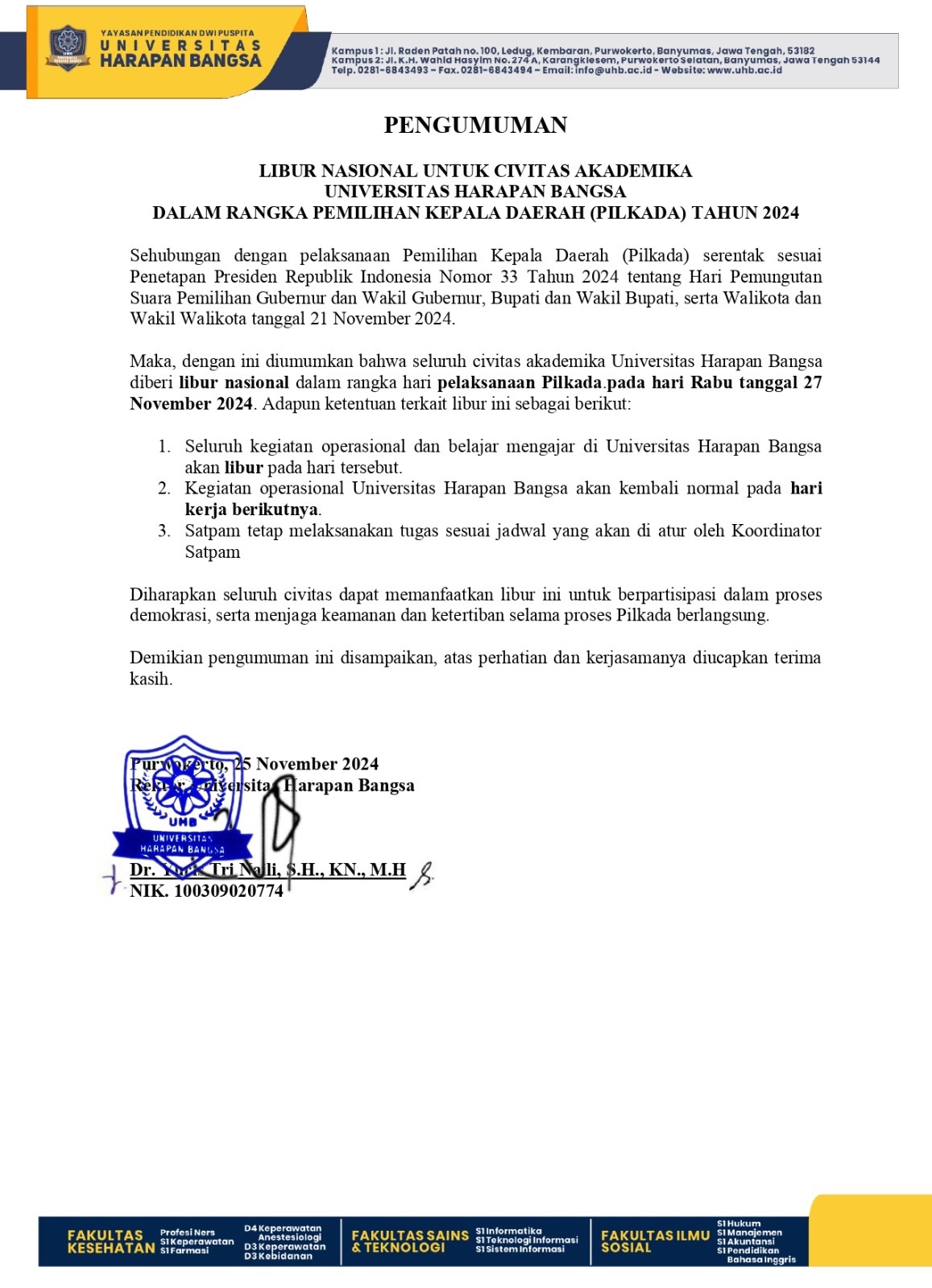 PENGUMUMAN HARI LIBUR NASIONAL DALAM RANGKA PILKADA by _ AMRI WIDADI, SKM, S.Kep.Ners - Tuesday, 26 November 2024, 9:35 AM Number of replies: 0 . Permalink