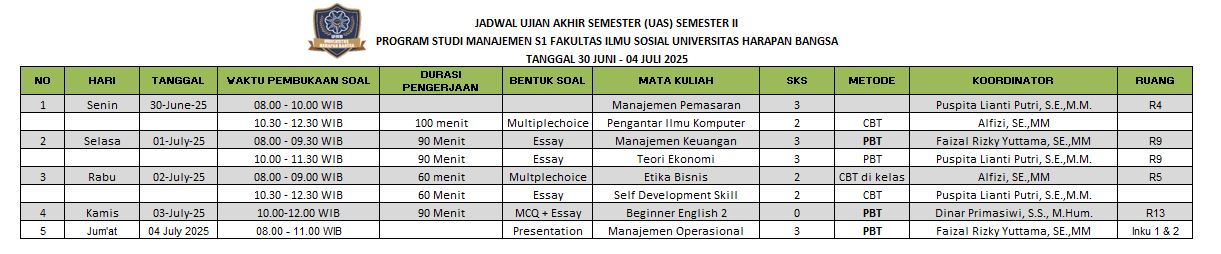 JADWAL UAS PRODI S1 MANAJEMEN SEMESTER II by _ AMRI WIDADI, SKM, S.Kep.Ners - Thursday, 26 June 2025, 11:10 AM Number of replies: 0 Permalink