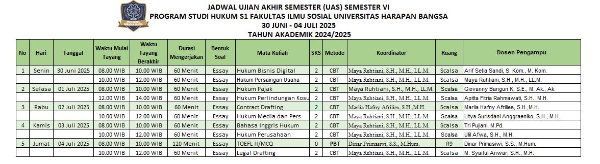 JADWAL UAS PRODI S1 HUKUM SEMESTER VI by _ AMRI WIDADI, SKM, S.Kep.Ners - Thursday, 26 June 2025, 11:28 AM Number of replies: 0 Permalink