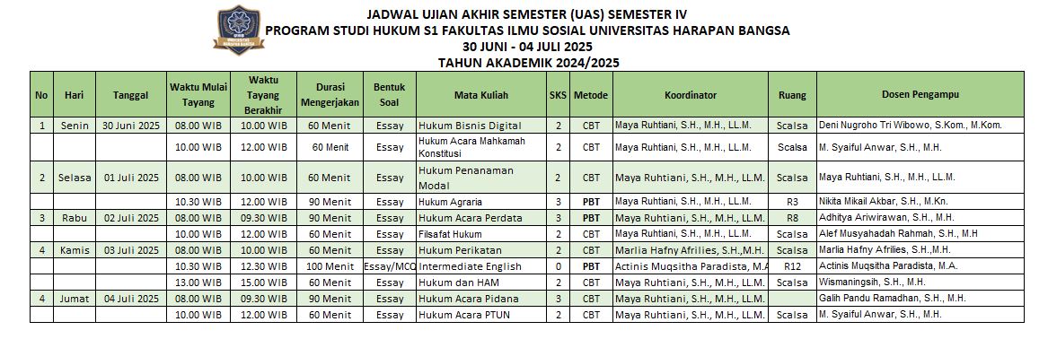 JADWAL UAS PRODI S1 HUKUM SEMESTER IV by _ AMRI WIDADI, SKM, S.Kep.Ners - Thursday, 26 June 2025, 11:28 AM Number of replies: 0 Permalink